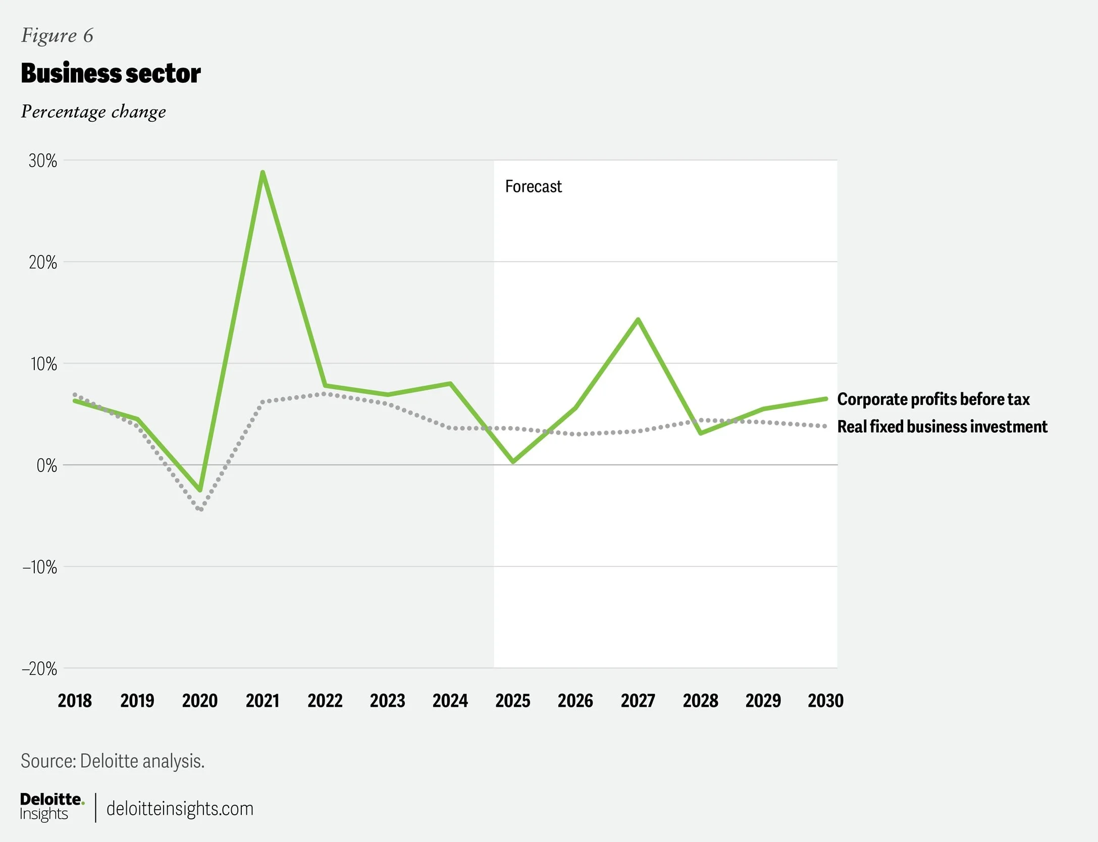 According to Deloitte’s U.S. Economic Forecast for 2025, business investment remains one of the most important indicators of an economy’s long-term productive capacity. Investment typically moves in cycles – rising during commodity or economic expansions and slowing during periods of uncertainty. Policy also plays a role, with incentives such as tax reductions or investment subsidies influencing timing and magnitude.